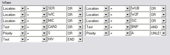 Say you want to monitor stats or asaps from 5 locations, any cardiacs or bnp's, but you don't want to see HIV's because those are batched tests: